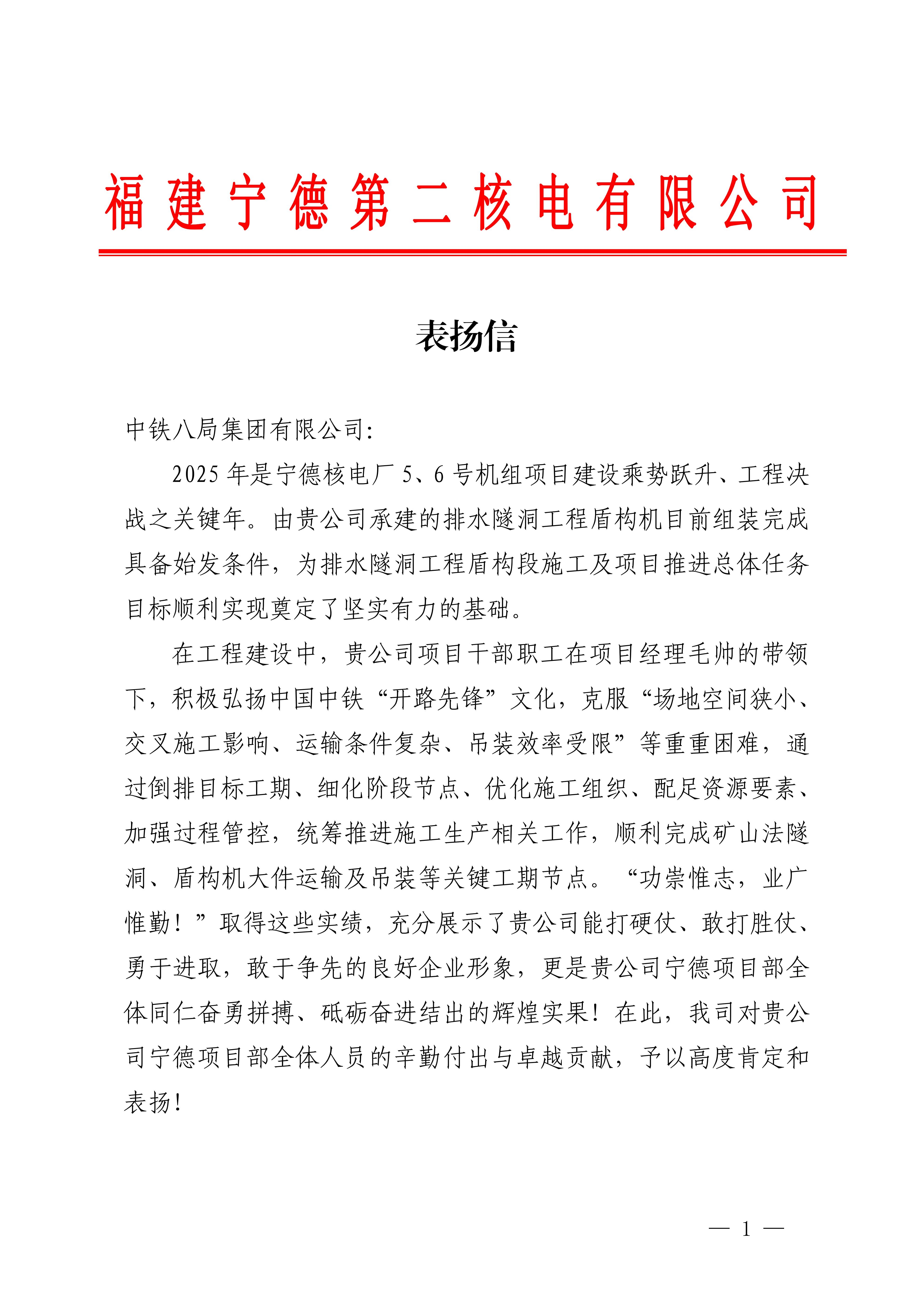 近日,宁德核电二期项目收到福建宁德第二核电有限公司发来的表扬信。