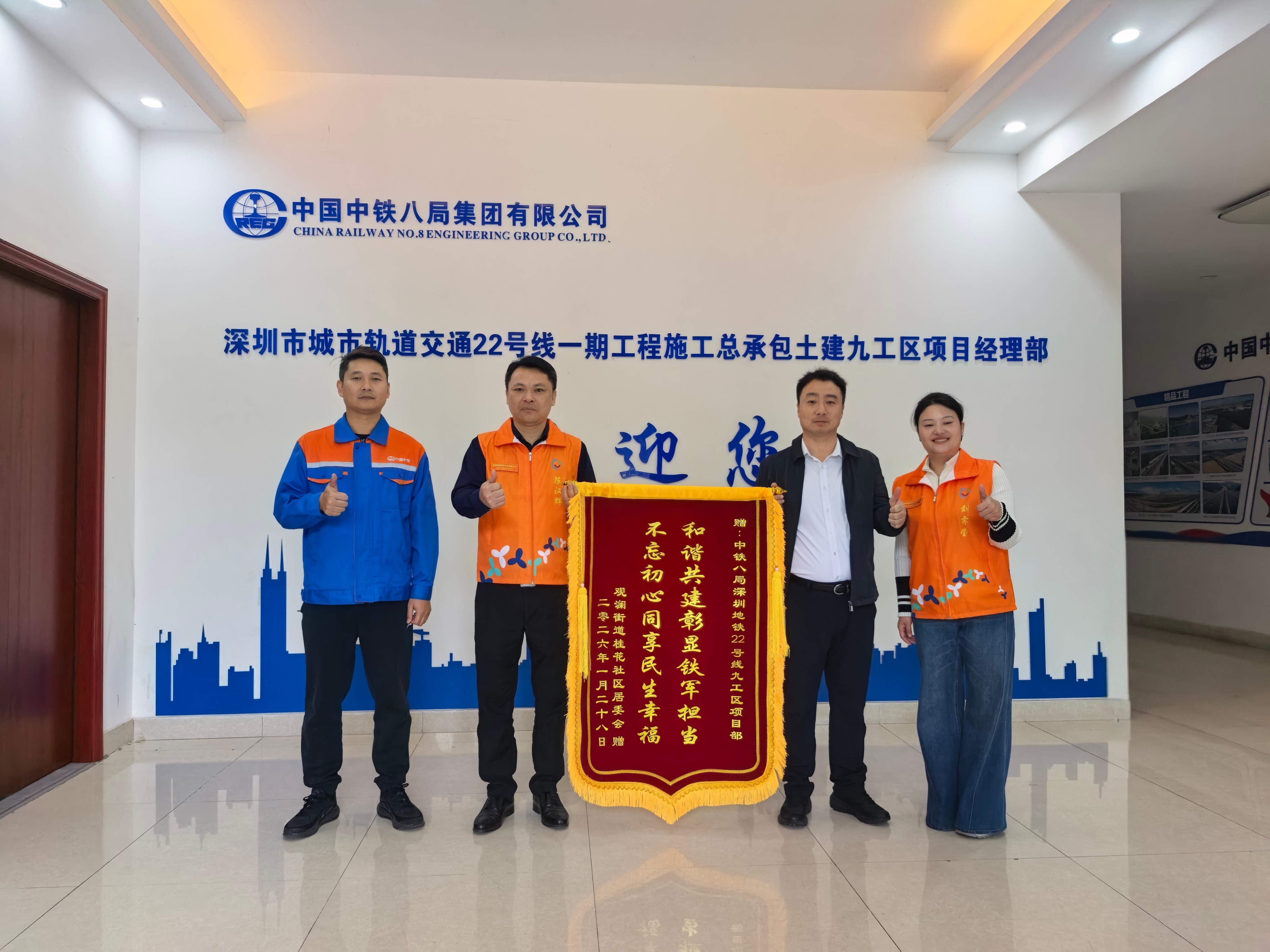 自进场施工以来,项目党支部紧扣工程建设中心任务,深入落实上级党委决策部署,扎实开展“强党建、促安全、扛责任、保履约”主题实践活动,牢固树立“一切工作到项目”“一切工作到支部”的鲜明导向,坚守“党旗飘扬在一线,党员干部冲锋在一线”的工作思路,推动党建与施工生产深度融合。通过设立党员先锋岗、成立党员突击队,组织党员干部扎根一线、冲锋在前,精准破解施工生产中的各类难题。同时,项目党支部持续深化党建联建,与深圳市龙华区观澜街道桂花社区党委建立深度协作机制,以“我为群众办实事”为出发点和落脚点,充分发挥自身优势,开展社区破损路面及锈蚀护栏修复、闲置土地勘察规划技术支持、老党员与困难群体走访慰问、植树增绿及阳台美化等生态共建活动,赢得社区及居民高度认可,收到社区赠送的“不忘初心同享民生幸福,和谐共建彰显铁军担当”锦旗,为项目顺利推进筑牢了良好社群基础。